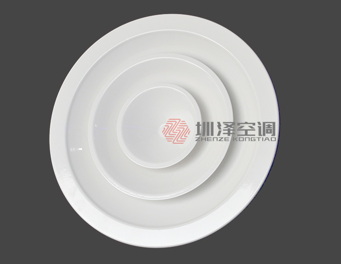 圓形散流器一般用于冷暖送風(fēng)。通常安裝在頂棚上。其吹出氣流呈貼附(平送)型,其結(jié)構(gòu)為多層錐面形。由于室內(nèi)誘導(dǎo)氣流大于排風(fēng)量,因此吹出氣流減速較快。因此相對(duì)任意大小面積來說可以供給較大風(fēng)量,而且在給定的風(fēng)量范圍內(nèi)擴(kuò)散半徑的大小變化.