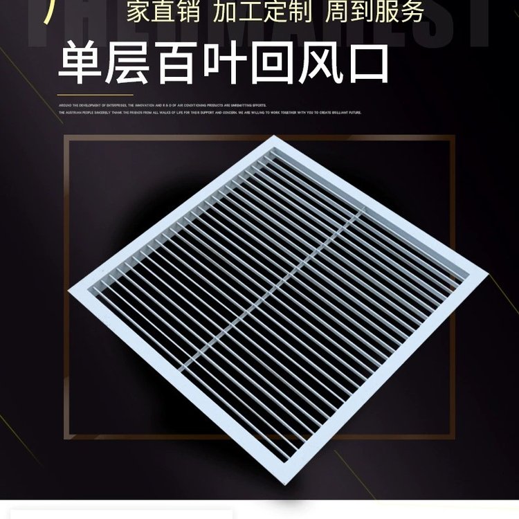 單層可調(diào)百葉風(fēng)口常用于管道中的吸、送風(fēng)用,同時(shí)可根據(jù)實(shí)際情況配上人字閘(多葉對開調(diào)節(jié)閥),用以控制風(fēng)量或安裝鋁合金過濾器,進(jìn)行配套使用。葉片可分為橫放和豎放兩種,可靈活的左右或者上下轉(zhuǎn)動,以控制氣流方向。