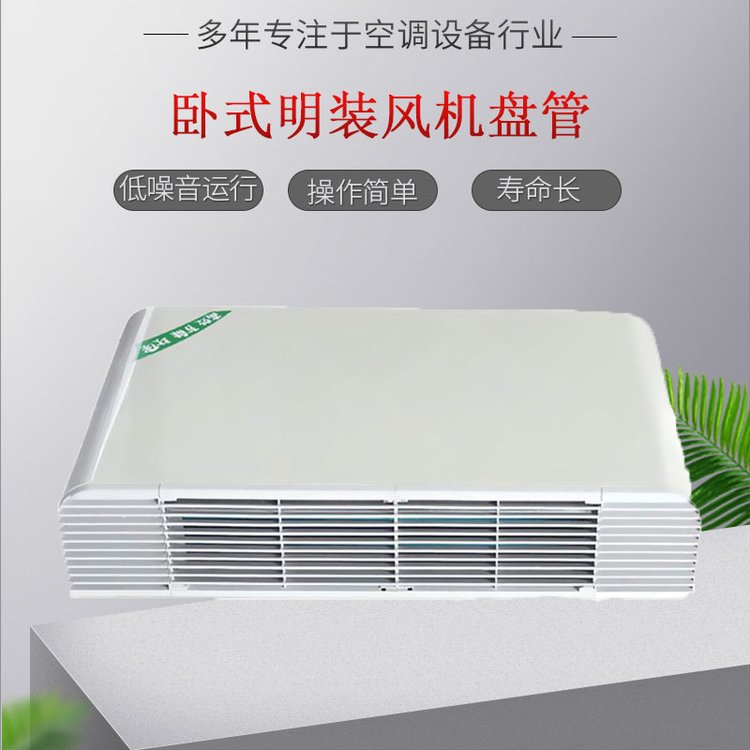 臥式明裝風機盤管機組主要由風機、熱交換器(盤管)、凝水盤、殼體及控制器組成,它適用于集中式空調系統。設計先進、品種齊全、性能優越,用途廣泛,通常用于要求噪聲小,溫度調節靈活的各種賓館、公寓、飯店、醫院、商業大樓等。